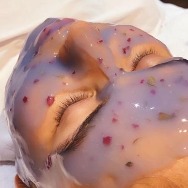 lavender, rose, 24k gold, and aloe. mask is brushed on where it solidifies and it peeled away.